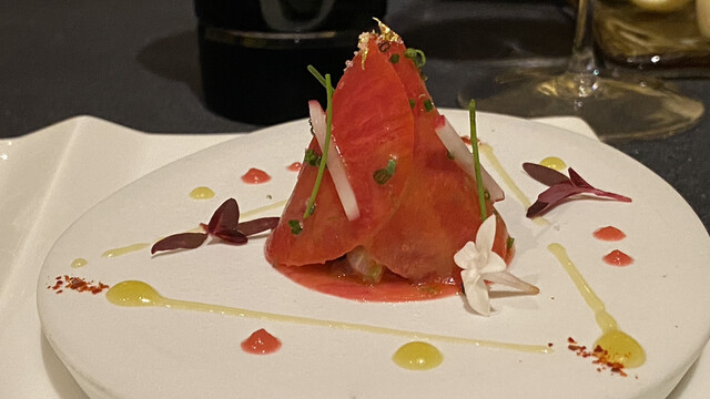 寒鰤のタルタルと根菜のラメルを甘酸っぱいカラマンシーのヴィネグレットで