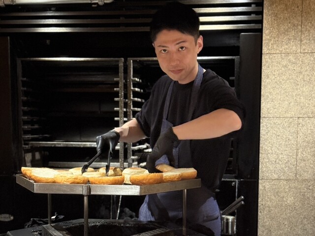 目の前で薪火を焚いてガンガンパティが焼かれ