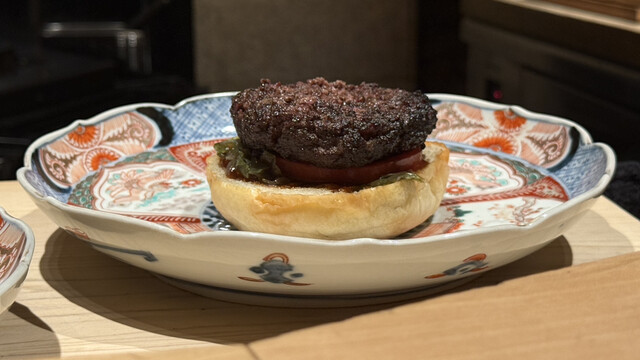 隣を見るとグルメパートナーがバーガーと悪戦苦闘