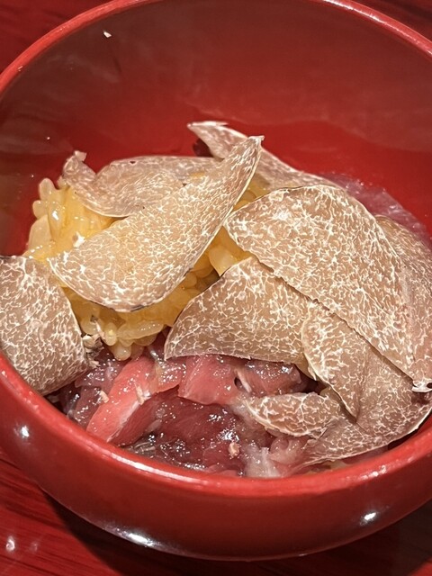 そして何品か挟み、次は看板メニューの卵かけ鮪ご飯に白トリュフ。最初のお米と硬さや食感が違う。