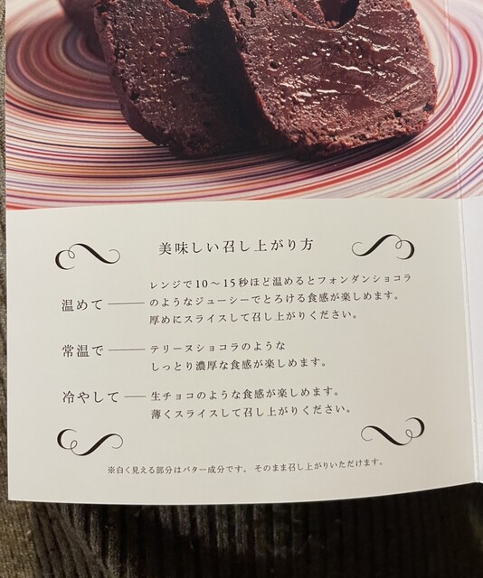 レンチン、常温、冷蔵の3種類の食べ方があります。10秒レンチンしただけてまったく別の食べ物になったからすごい。冷やして生チョコのような食感もとても美味しい。賞味期限が冷蔵だと2週間もつのが贈り物にもありがたい。