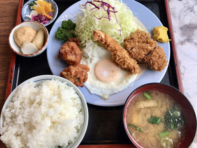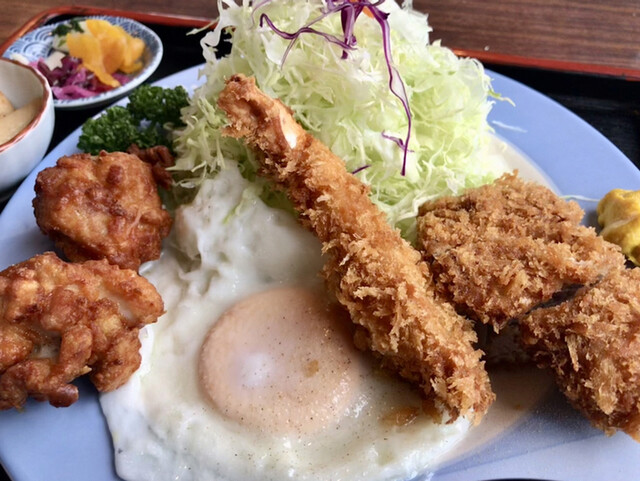 ヒレカツ、エビフライ、唐揚げ、目玉焼き