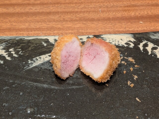 こちらのお店のとんかつは、じっくりと低温で揚げる製法が特徴です。コースで提供されるお肉はどれも驚くほど柔らかく、一口食べた瞬間にその丁寧な仕事ぶりが伝わってきます。通常の高温でカラッと揚げるとんかつとは一線を画す、しっとりとした食感が楽しめました。低温でじっくりと火を通すことで、肉本来の旨みがしっかりと閉じ込められているのでしょう。