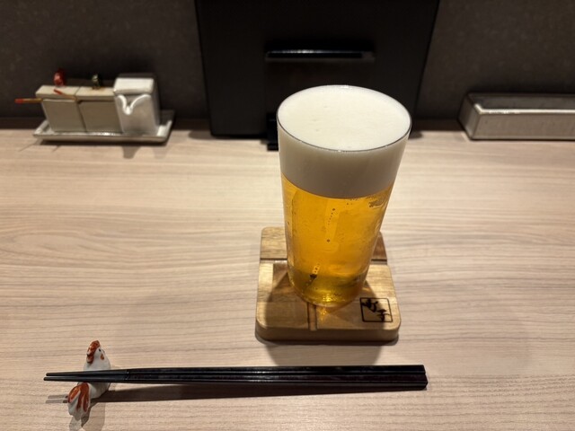 予約して行きました。人気店なので予約したほうがいいと思います。 カウンターに着席。まずはビールから。この日も暑かったのでビールが美味しい。
