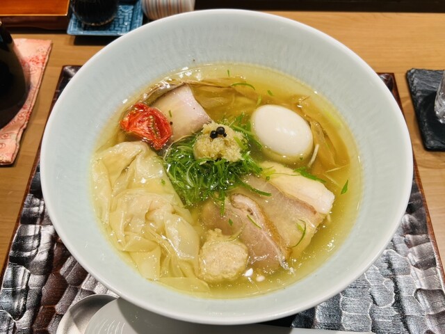 待つこと5分ちょっとで着丼。鴨鶏系の深みのある出汁に香ばしい醤油を合わせたスープは一口目からウマ〜となる味わい。中太手揉み麺はプルプル食感でスープがよく絡みます。3種チャーシューの中では鶏チャーシューが食感、味わいとも秀逸。ワンタンやつみれ、味玉など具材にも相変わらず隙が無く、塩そば、胡椒そばに続いて期待通りの完成度の一杯を美味しく完食しました。(その中で敢えて選ぶなら。。やっぱり最初に食べた塩そばですかね)