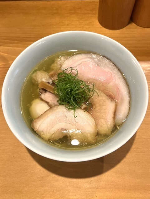 こちら言わずと知れた鶏清湯醤油の最高峰ですが、今日は久しぶりに塩と決めていたので特製(豚)塩そばをポチリ。およそ5分で着丼です。深い黄金色のスープを一口飲むと、分厚くてパワフルな鶏出汁の旨味と塩ダレのミネラル感に口の中を支配され、とにかくその存在感が圧倒的。バラ、ロースなど3種のチャーシューに生姜香るワンタン、火入れも味染みも完璧な味玉など具材も相変わらず隙の無いクオリティ。ちなみに今日はシルキーな細麺にしましたが、このパワフルなスープには太麺の方がバランス良いかも?とも思いつつの完食でした。