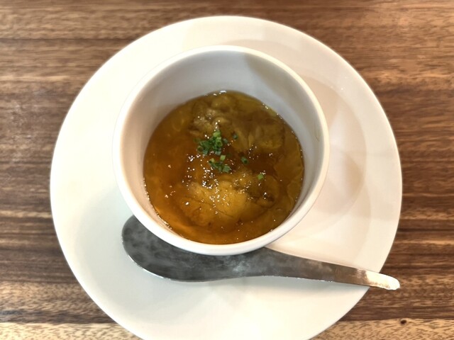 シェフの修行先の名物メニューということのようで、奥尻産ムラサキウニの濃厚な旨味とコンソメの風味が融合。味わいも食感も溜まらない美味しさです。