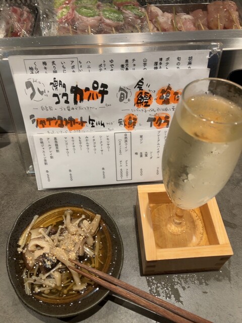 スタッフのお勧めメニューである胡麻カンパチとおまかせ串焼5本盛をまずは注文。 ドリンクも嬉しいことにワインの種類が豊富だったので、山盛りスパークリングを注文。