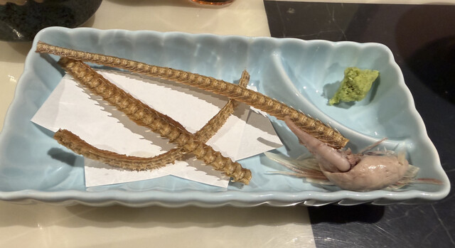お通しは骨せんべいと肝。あと前菜で、ごぼうの煮物と鰻ざくを頼んだ。