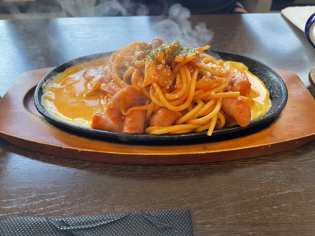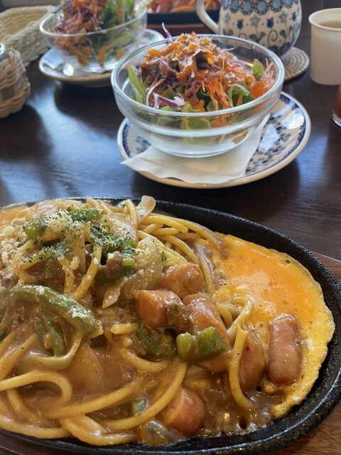 メニューを開けて、パスタを見るとあんかけ風なスパは無く、でもいくつかあったので、妻は、鉄板ナポリタンスパゲッティ、私は、鉄板インディアンカレースパゲッティ、で、それにそれぞれ、ミニサラダをつけて携帯でオーダー。