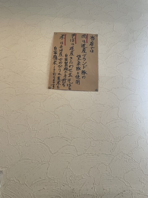 壁に、こだわりの望来豚の肉、ごはんはおぼろづき玄米との事。
