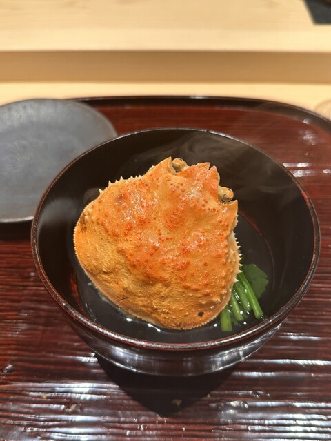 →ほぐし身・内子・外子のしんじょうが全ての蟹の要素を感じられとても香り高く非常に美味しい一品でした。梅貝は一度取り出して肝を切ってあり食べやすい工夫が施されていました。