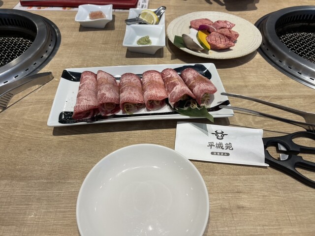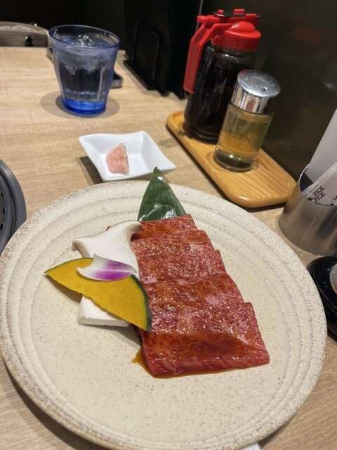 和牛特上カルビ(タレ)、ねぎタン塩、厚切り特上タン塩、和牛熟成厚切り赤身(塩)、大とろホルモン(塩)、レバー(塩)、海鮮チーズチヂミ、ミニビビンバ、をオーダー