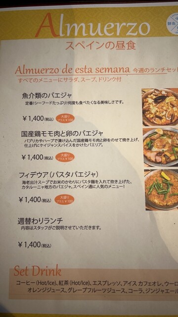 ママランチ会で利用しました。土曜日でも平日と同じランチセットが利用できて、ドリンク付きで1,400円はとてもコスパがいいと思います。駅から少し離れていますが、パエリアめちゃくちゃおいしかったですし、店員さんも感じがよくてまた伺いたいと思います
