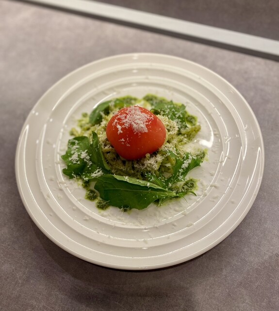ジェノベーゼの上に湯むきしたトマトと中からチーズがたっぷり!絡めて頂きます。トマトであっさり頂けるここでしか頂けない女性人気No.1のパスタ。