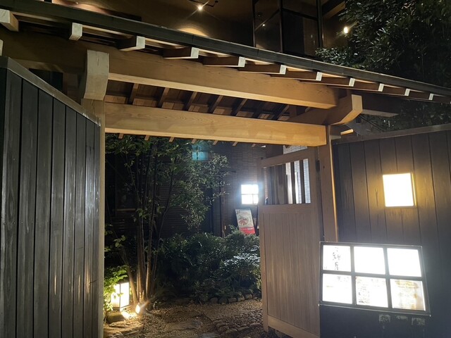 かくれんぼ横丁に入る石畳の道に黒い門があり、日本庭園を抜けてエレベーターを登るとお店があります。