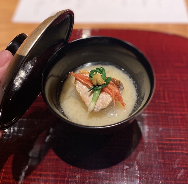 鰤と出汁で炊いた聖護院蕪。甘めの味噌の御椀を締めてくれる辛子のバランスが絶妙。
