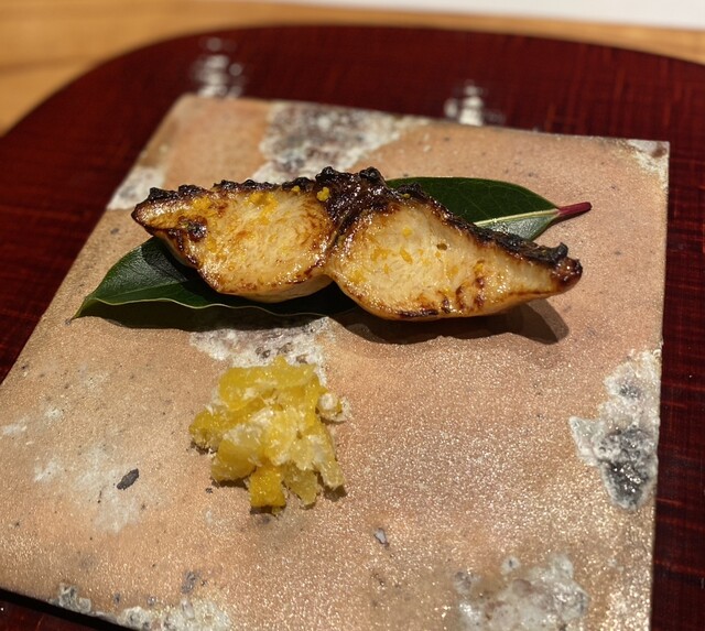 香ばしく焼かれた鰆幽庵焼きは熟成された深みを感じる。添えられた編傘柚子を箸休めに、柚子と鰆を存分に楽しめる。