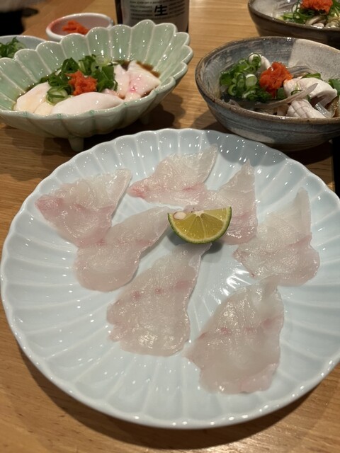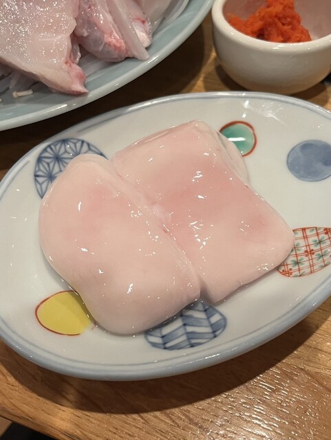 こちらも今まで見たことがないくらい厚切りです。これも1000円はかなり安いです。すだちを絞ってポン酢をほんの少し漬けて食べます。歯応えも良く、今まで食べたてっさの中でおそらく1位のおいしさだと思います