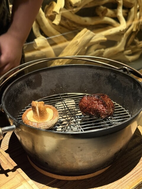 メインのお肉。備前黒毛和牛と神山椎茸。薪で肉汁が出ない様に、特殊なやり方でミディアムレアに火入れしたもの。ヒレの中心部で非常にタンパクであっさりした味わい。柚子胡椒と薪のススを加えた黒い銀蔵の塩で。神山椎茸は大振りで瑞々しく美味でした