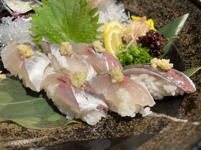 続いて真鯵の活け握り。入り口で見た生簀からあげてすぐに握りに仕立ててくれます。