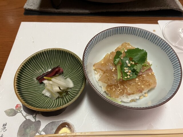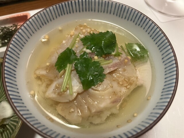 出汁をかける事で鯛の刺身に火が入って美味しいですね。