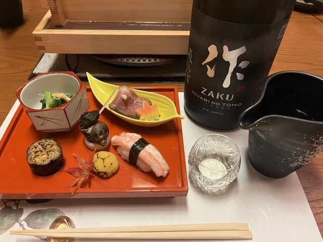 シラスと油揚げと菜葉のお浸し、合鴨の燻製、ズワイガニ寿司、バイ貝旨煮、茄子田楽、焼き栗