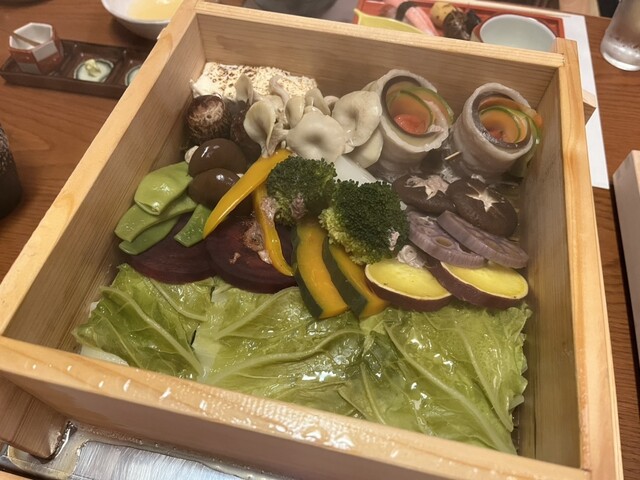 野菜はキャベツ、さつま芋、かぼちゃ、ビーツ、蓮根、椎茸、ブロッコリー、パプリカ、モロッコインゲン、大黒しめじ、衣かつぎ、焼き豆腐、たもぎたけ、蕪、トマトの豚巻きです。
