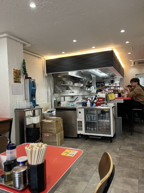 お冷はセルフスタイル、台の下には紙エプロンも用意されているのが嬉しいですね。