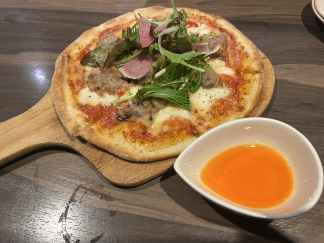 本日の自家製ピザはトマトベースのソースにチーズ、自家製ソーセージ、プチトマトのピザに水菜と紅大根のサラダが乗っています。