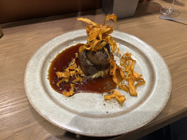 おおいた和牛 お贅沢ロッシーニはおおいた和牛のステーキの上に、フォアグラを包んだハンバーグが乗せてあり、人参のフリットとハッシュドポテトが添えてあります。