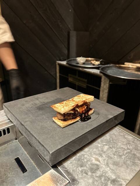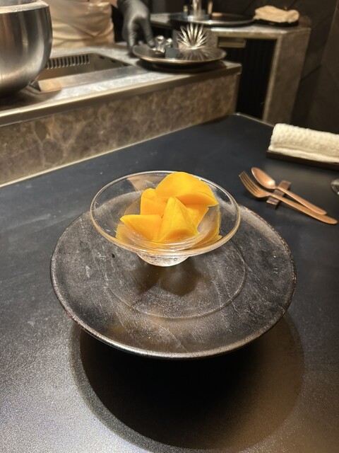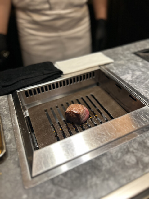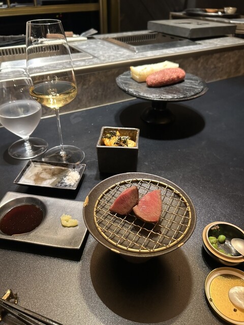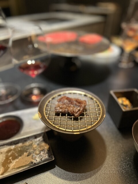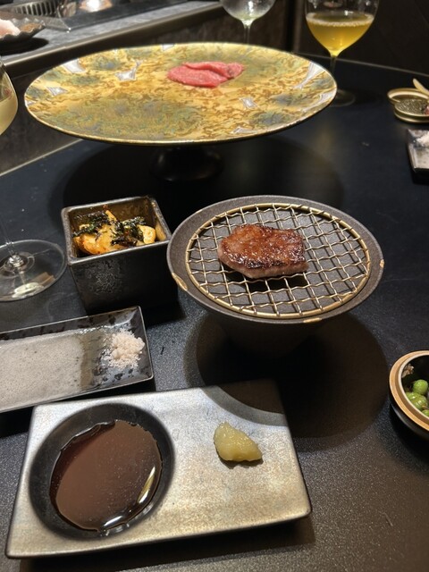 ランプ照明に照らされたカウンター席では、目の前で焼き上がるお肉の香りとライブ感が際立ちます。Soraコースには和牛のシャトーブリアン、サーロイン、タンといった厳選部位や季節の野菜が織り交ぜられていて、肉質もさることながらカットや火入れの技術に感動しました〜