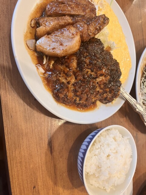 トンテキとハンバーグとだし巻きが乗ったコンビを注文。
