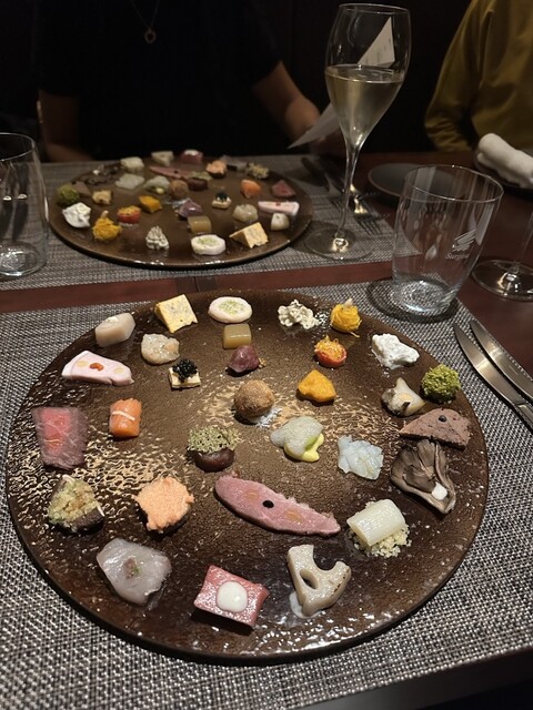 最初に登場するのは、お店の名前を冠した前菜の盛り合わせ。大皿いっぱいに小さな料理が散りばめられ、見た瞬間から気分が上がります。