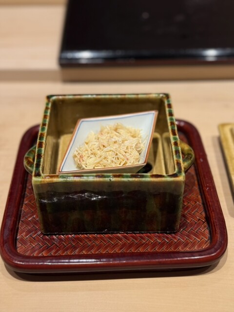 握りは新潟の中トロ、大トロから始まる。ここだけは例外的に豊洲経由のマグロだが、脂の量で押すのではなく、温度管理と切り付けによって食べ進めやすい状態に整えられている。アオリイカは米酢のシャリを使用し、長谷川さんによる神経締めらしい鮮度と、噛むほどに出てくる甘みが特徴的だった。明石の鯛、藤本さんの白甘鯛、明石の鬼鯵に紫蘇と続き、いずれも産地直送ならではのフレッシュさはっきりしている。毛蟹の蒸し寿司で一度流れを切り替え、新子、赤身、長谷川さんの金目鯛、天草の鯵と、江戸前の基本を淡々と積み上げていく。