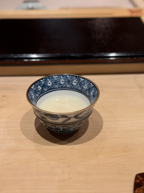 つまみは新潟・佐渡島の黒アワビから始まる。肝ソースには和歌山の白味噌が加えられているが、味噌の存在感は控えめで、アワビの旨味と肝の苦味をまとめるための補助的な役割に留まっている。続く利尻のバフンウニはいちご煮として仕立てで、ウニの甘さを強調するというより、出汁と海水の中で自然に成立させる構成。直前に使われたアワビの貝柱をここで再び出すことで、コース全体に一貫した流れを持たせている。カツオは皮目のみを炙り、香ばしさを最小限に加える仕上げ。藤本さんが獲った縞鯵も同様に皮目だけを炙り、すっぽんの出汁で仕上げたジュレと合わせることで、脂とコクが前に出すぎないバランスになっている。神経締めの鯖寿司は酸を立てすぎず、身質と鮮度の良さを前提にした作り。焼きボタン海老には和歌山の三ツ星醤油を塗り、最後は鯛のお出汁で口内を整えてつまみが終わる。