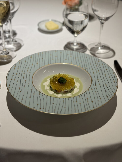 ジュレ甘み、キャビアの塩味、香草のニュアンスが一体となり、口の中で小さなオーケストラが始まる。