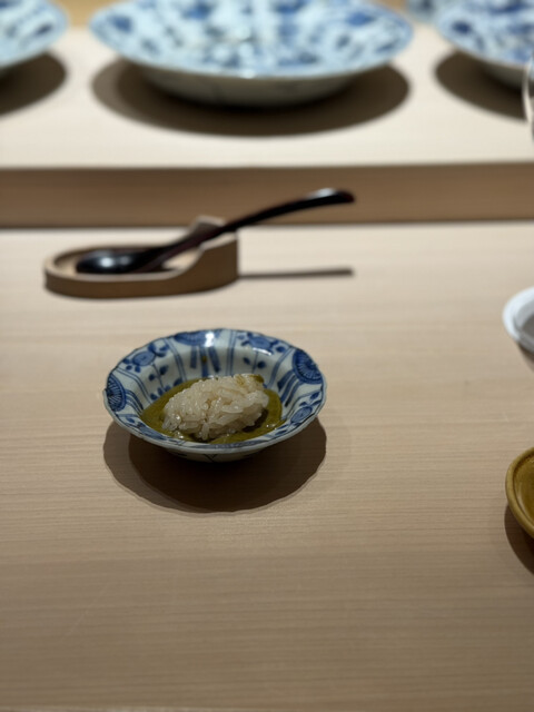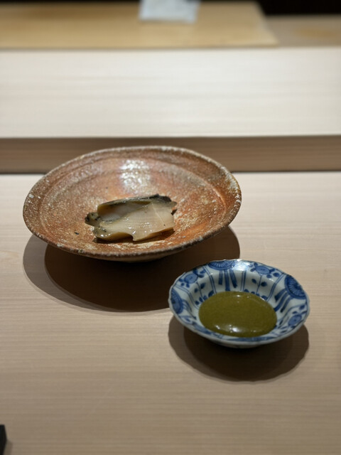 続く青ウナギは、岡山で穴雑魚を食べて育ったという、力強い旨味と締まりが別格。愛南町で前日水揚げ、今朝神経締めされた胡麻鯖の鮮烈な脂。松山・二神島産の黒アワビは、6時間蒸しという最高の火入れで、その柔らかさと磯の濃厚な香りに唸らされます。高知の金目鯛、愛南町のクエと、旬の魚介が贅沢に続きました。
