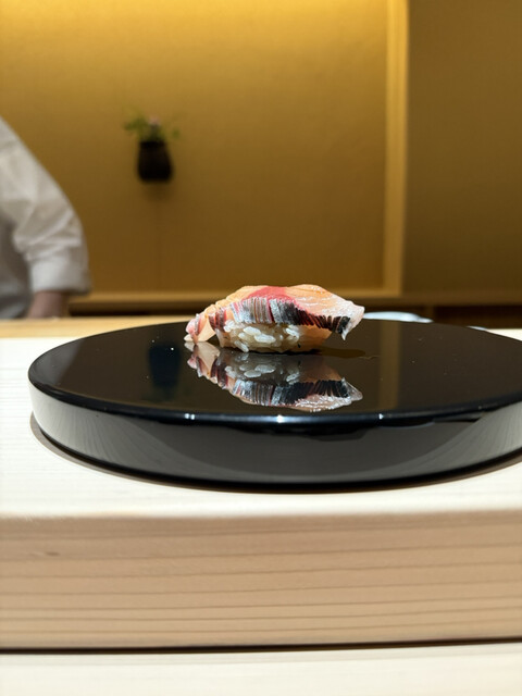 そして、この日のハイライトの一つが、藤本さんから直接届いた大島産のマナガツオです。鮮度抜群のマナガツオは、程よい酸味と旨味が絶妙。また、エボダイは徳島産。四国の一部ではシズやウオゼとも呼ばれるこの魚を、大将が巧みに握りに仕立てています。