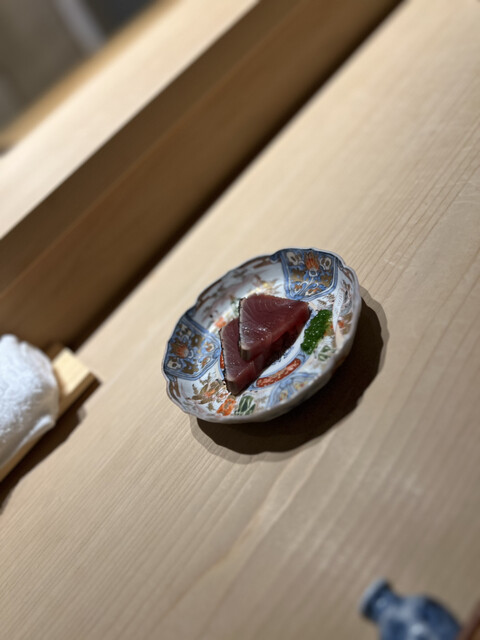 最初の二貫が、いきなりマグロだった。江戸前の定石では、白身やイカなど淡いネタから入り、中盤にマグロが出てくるはずだ。