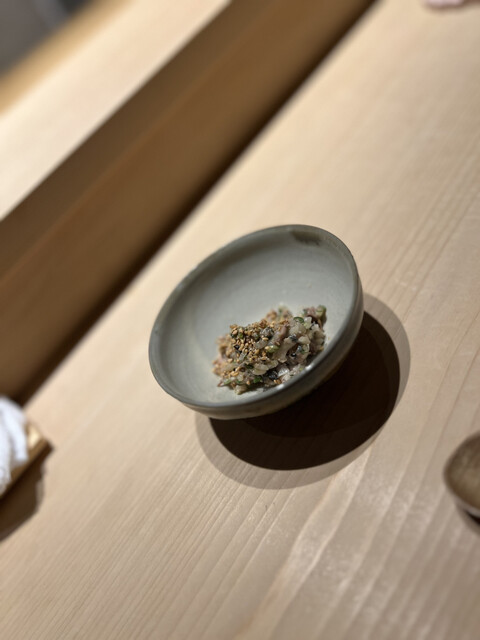 焼いた秋刀魚を細かく刻み、シャリ、肝汁、大葉、葱、胡麻を合わせる。主役は秋刀魚の香りと濃厚な肝だが、大葉が油分を切り、葱と胡麻が香りに奥行きを与える。要素は多いのに、味は散らからない。よく考えられた一品だ。
