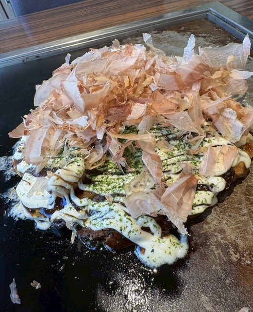 定番のお好み焼き。生地の香ばしさと具材のバランスが良く、ソースの甘辛さが食欲をそそります。
