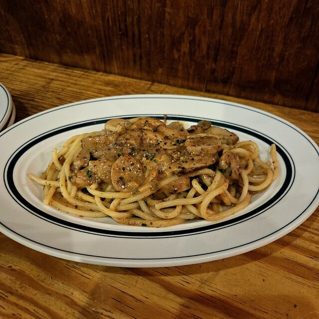 パスタはキノコ系のパスタ!艶っつやのオイル系ですが、提供された時点からキノコの香りがよく、食欲がそそられます!麺も太めで、濃厚な味つけがよく絡んでおいしかったです!パスタに合うワインをおまかせでお願いしましたが、とても飲みやすかったです!