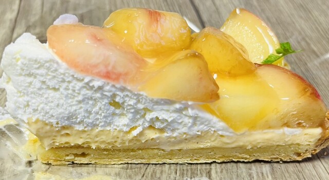 完熟した桃の風味良く、柔らかめのタルトと硬めの種類の桃を使った歯応えのある優しいタルト。