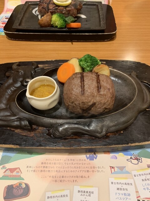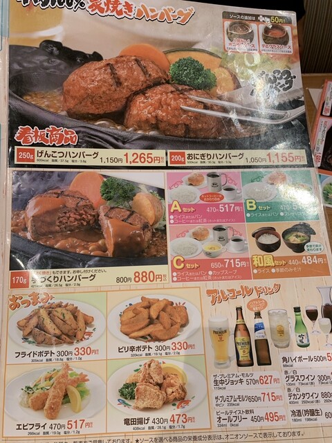 げんこつハンバーグ250g1265円、厚切りロースステーキセット300g 2750円を注文。
