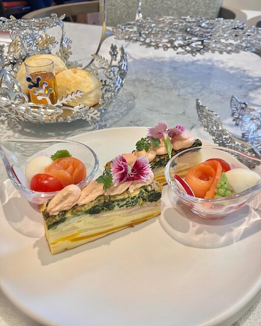 セイボリーはスモークサーモンとモッツァレラのカクテル、キッシュミルフィーユ