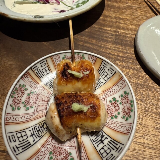 この夜は、焼鳥を軸にいくつかの一品を組み合わせた。まずは「ヨーグルトソースのサラダ」。わやらかな酸味が口内を静かに洗い流し、次の一串への導線をつくってくれる。たかがサラダ、されどサラダ――流れを知る料理だ。