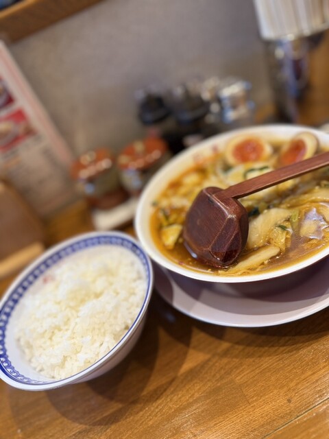 サイカラーメン(1玉)にトッピング味付け煮玉子とライス(中)を注文しました。
