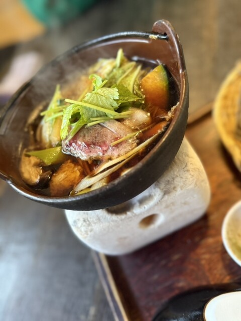 鴨鍋の中には鴨肉、肉団子と野菜が沢山入っていてしっかりしただしが蕎麦とよく合いとても美味しかったです。