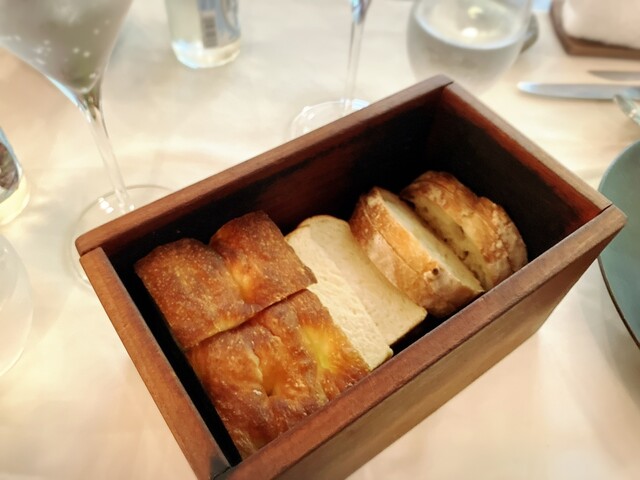 イタリアでよく食べられるグリッシーニが出てきて、食事と一緒に素敵な箱に入った自家製のパンがサーブされます。お店のコンセプトはもしイタリアに京都という州があったら、というもので京都の食材を活かし、イタリアのスローフードの考えに基づいたお料理の数々です。どれも素材の味が美味しくて、ひとつひとつの盛り合わせも丁寧です。本当に食べることを楽しむコースだと思います。